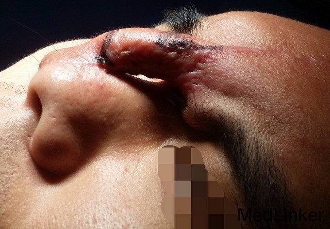 鼻翼缺损较大,运用额部皮瓣转移修复鼻翼,需多次手术才能达到满意效果