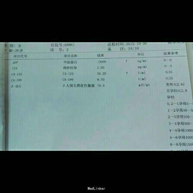 全身检查无异常,妇检外阴、阴道无异常;宫颈光滑,无举摆痛;宫体正常大小,活动好,压痛;左附件区扪及6*5*5cm大小质中包块,边界清楚,形态规则,活动好,触痛;右附件区未及异常。 B超:左附件区混合回声团块(5.7*3.8*5.6cm),考虑畸胎瘤。 入院查CT:左附件区囊实性占位(4.5*6.7*5.5cm),内见多发结节样高密度影,畸胎瘤可能。 肿瘤标志物:AFP >3000ng/ml,CA-125 50.2U/ml。