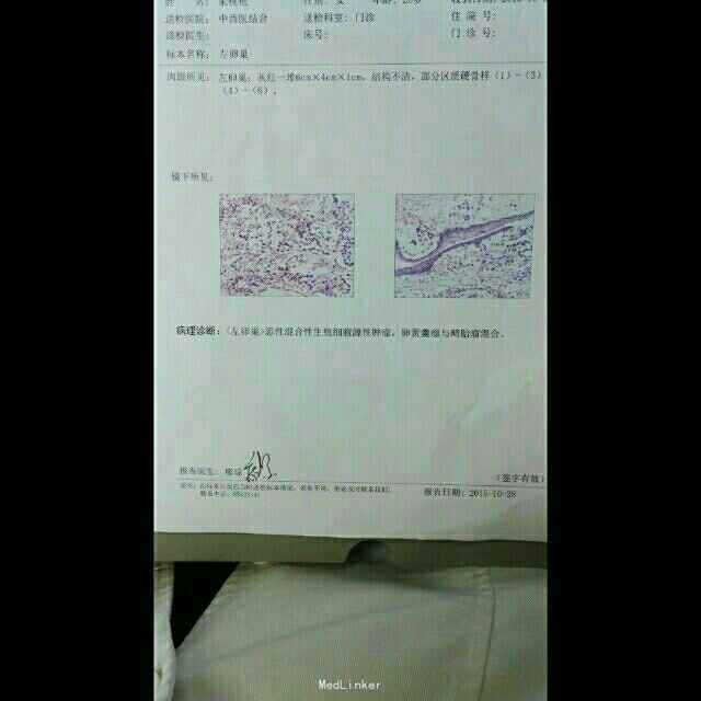 术前诊断:1.左附件包块 2.急性盆腔炎 术后诊断:1.左卵巢恶性混合性生殖细胞肿瘤一期 2.急性盆腔炎 入院完善检查,静脉抗炎治疗,排除手术禁忌后,行腹腔镜探查术,术中见左卵巢增大约6*6*5cm,表面光滑,内见一大小约4*5*4cm包块,部分灰白色,部分为陈旧出血灶,见部分骨性组织,左输卵管、右附件、子宫外观及质地正常,盆腔少许血性积液,探查腹膜、大网膜、肠管、阑尾、腹壁、肝脏表面未见异常结节。手术完整剥除左卵巢包块送快速病理冰冻检查,结果回报:左卵巢恶性肿瘤,倾向于卵黄囊瘤,见部分畸胎瘤成份。手术行左附件切除术及右卵巢活检术。 术后常规抗炎、对症治疗,术后恢复好,切口甲级愈合。术后病检回示:左卵巢剩余组织间貭见部分疏松粘液网状组织,灶性S-D小体,考虑卵巢卵黄囊瘤,左输卵管断端见部分疏松网状组织,右卵巢黄体囊肿,冰冻病理最终结果示:左卵巢恶性混合性生殖细胞源性肿瘤,卵黄囊瘤与畸胎瘤混合。术后5天出院,入住省肿瘤医院行化疗及下一步治疗。