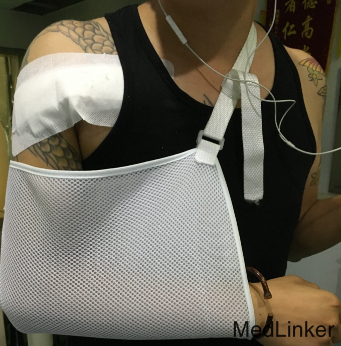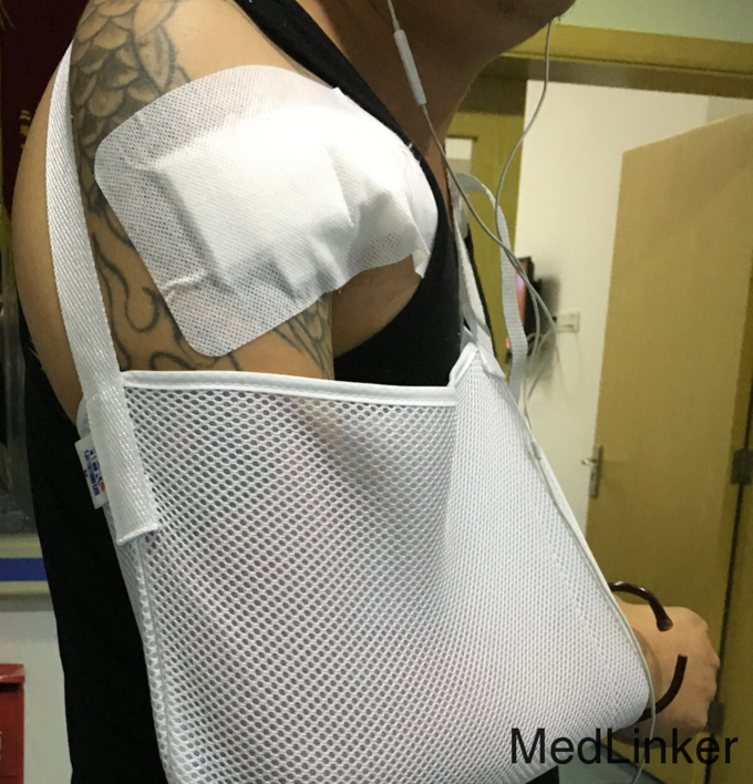 右侧臂丛神经阻滞麻醉 右肩关节前路切开复位螺钉内固定术 术后12日右上肢悬吊固定