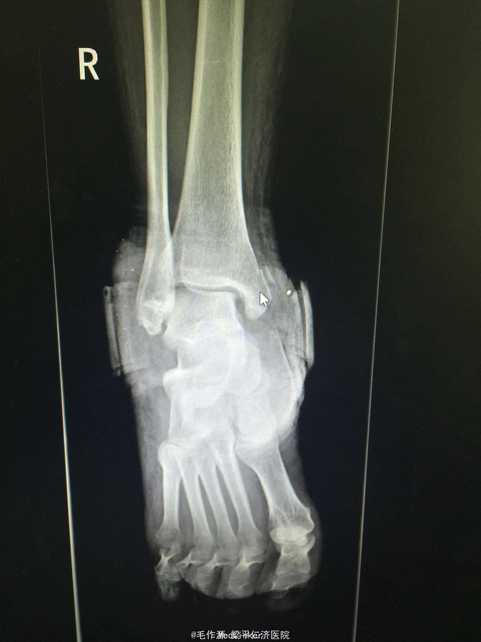 右踝关节肿胀明显,畸形,可见大量皮肤瘀斑形成,局部压痛明显,可扪及骨擦感及骨擦音,踝关节活动因负痛不能活动,足背动脉可扪及,肢体远端血运及感觉无异常。 右踝关节DR正侧位提示:右侧内外后踝骨折伴踝关节半脱位。