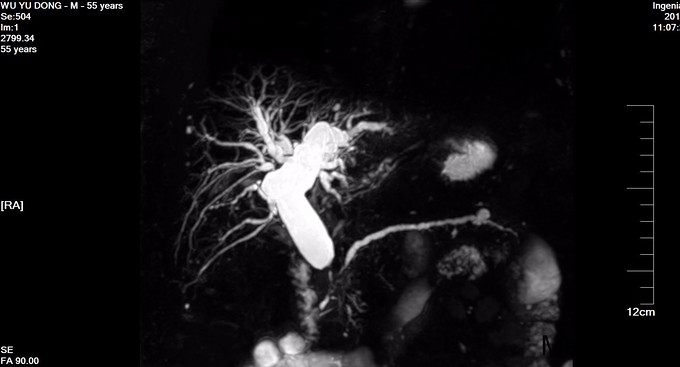 查体:全身皮肤及巩膜黄染,腹部膨隆,无胃肠型,腹软,中上腹压痛,无反跳痛,肝脾未触及,肝肾区无叩痛,肠鸣音6次/分,移动性浊音(-)。 辅查: CT:胰头部隐约见弱强化灶,局部门脉管径变细,胰头周围及腹膜后见增大淋巴结。胆总管胰腺段管壁增厚,明显强化,近端肝内外胆管扩张。胰管未见扩张。胰尾部见小囊状不强化灶,长径约8mm。MR 肝脏表面光滑,各叶比例协调,肝实质信号欠均匀。肝内外胆管普遍扩张,胆总管下段狭窄,中上段扩张,最宽处约1.8cm,胆囊壁增厚,其内信号不均。胰头部见稍长T1稍长T2信号影,境界模糊,范围约2.9cm×1.5cm,胰腺体尾部见长T1长T2信号结节影,大小约8mm×3mm,胰管轻度扩张。脾脏不大。 MRCP:肝内外胆管普遍扩张,胆总管下段狭窄,中上段扩张,宽约1.8cm,胆囊轮廓不清。胰腺体尾部见长T2信号结节影,大小约8mm×3mm,胰管扩张,胰腺头部主胰管狭窄。血清胆红素190.1umol/L,以直接胆红素升高为主。