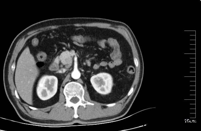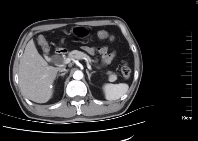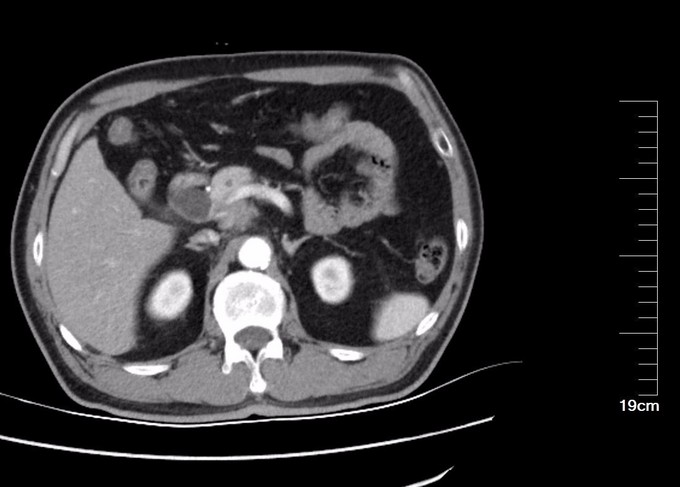 主诉:上腹痛1个月。 病史:患者1月前出现中上腹持续性钝痛,位置不定,餐后加重,无恶心呕吐,自服三九胃泰,奥美拉唑等胃肠道药物,症状未见缓解,于东港市中心医院CT检查示:胰头占位病变,考虑胰头癌及低位胆道梗阻。为进一步诊治,以“胰头占位”收入我科。现患者一般状态可,饮食略差,睡眠差,小便黄,色深,大便正常,体重减轻2.5公斤。
