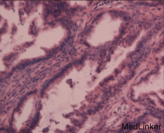 诊断: 胰头占位 恶性可能大 治疗:全麻下手术探查:肝脏於胆改变,无转移结节,腹壁及盆腔未见癌转移,胰头略增大,切开kocher筋膜,游离十二指肠降段,显露胰头后方,触及胰腺钩突2.5×2.0cm质硬肿物,界不清,胆囊无明显增大,约7×4×3cm,肝总管、胆总管全程明显扩张,直径约1.8cm,术中诊断胰腺头部占位,行胰十二指肠切除术,术中冰冻病理及术后病理证实恶性。病理镜下:癌细胞呈不规则腺样,筛网状排列,部分区域见淋巴组织。胰腺腺癌,高分化,肿物周围见少许淋巴结结构,考虑淋巴结受侵及,胃、肠、网膜未见癌,慢性胆囊炎。CD34及D2-40染色未见明显脉管癌栓,S-100染色见神经侵犯。