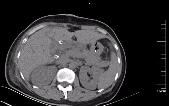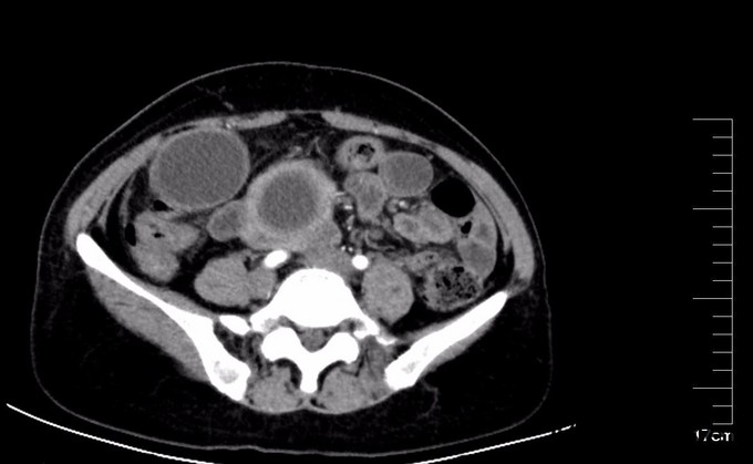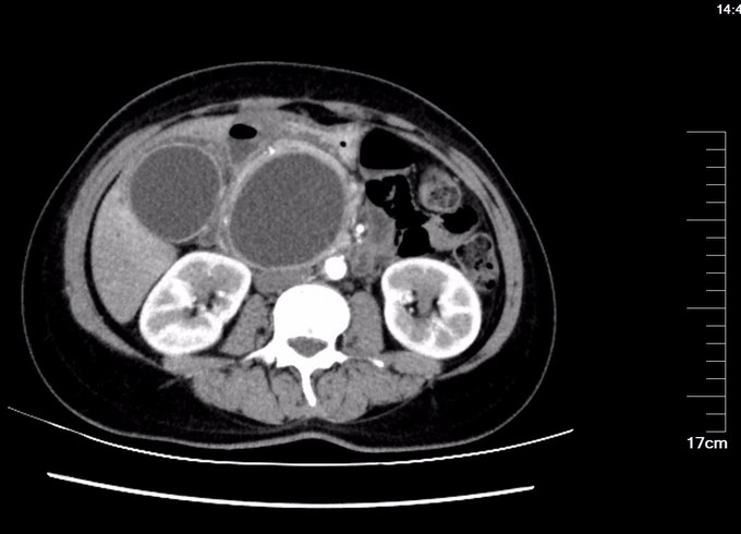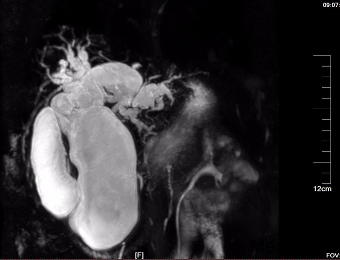 查体:腹部略膨隆,未见胃肠型及蠕动波,未见腹壁曲张静脉,右上腹部压痛阳性,无反跳痛或肌紧张,未及包块,肝脾肋下未及,Murphy氏征阳性,肝区扣痛阳性,肾区无扣痛,肠鸣音减弱,约4次/分,未闻及气过水声。 辅查: MR平扫+增强:肝脏大小形态未见异常,各叶比例正常,未见异常信号灶。肝内胆管、胆囊管及胆总管多发囊状扩张,胆总管直径6cm左右,壁厚且明显强化,腔内点状T2WI低信号影。胆囊饱满,其内可见聚集点状低信号影,胆囊壁增厚且明显强化。门脉血管显示清楚,走行正常。胰腺形态信号未见异常,胰管未见扩张。脾脏不大。增强扫描未见异常强化病灶。 MRCP:胆囊体积增大,肝内胆管、胆囊管及胆总管多发囊状扩张。胰管显影,形态走行未见异常。 CT 胆总管囊状扩张,囊壁较厚,前壁见点状钙化,较宽处直径约6.7cm,胆总管末端壁增厚,管腔狭窄;增强扫描扩张胆总管壁明显强化。肝内胆管扩张,胆囊增大,胆囊壁增厚、强化尚均匀,囊内未见异常密度影。 肝内未见异常密度影。胰腺形态、密度未见异常。脾不大。腹膜后未见确切肿大淋巴结影。