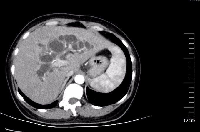 主诉:右上腹绞痛10余年,伴加重3天 病史:患者10余年前无明显诱因出现右上腹绞痛,向右肩及右腰部放散,于当地医院诊断为“先天性胆囊扩张,胆囊结石”,保守治疗后出院。10余年来间断右上腹痛,均自行口服“消炎利胆片,排石颗粒”后好转,3天前,再发右上腹绞痛,伴发热,自行口服“消炎利胆片,排石颗粒”后症状无好转,当地医院急诊超声检查示:肝外胆管囊性扩张伴结石,肝内胆管扩张,左肝内胆管结石,胆囊大伴泥沙样结石。经当地医院抗炎治疗后发热症状好转,为求进一步诊治来我院。病来患者有发热,有胸闷气短,无咳嗽咳痰,精神状态差,饮食睡眠差,二便正常,体重未见明显变化。