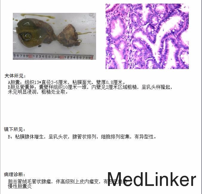 诊断: 胆总管囊肿 治疗:全麻下手术治疗。术中探查,见胆囊大10x6x4cm,肝门部可触及肿大胆总管,直径约6cm,向下延续到胰腺段,切除胆囊,于肝总管横断,向下剥离胆总管,直至胰腺段,仔细分离胆总管与胰腺,避免胰腺组织破碎,直到胆总管变细部位,切断之,远端缝扎,继续行肝管空肠Roux-en-Y吻合术。术后病理胆总管绒毛管状腺瘤,伴高级别上皮内瘤变,有恶变趋势,慢性胆囊炎。