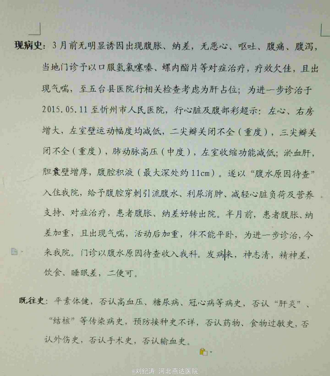 主诉:腹胀、纳差3月,加重伴气喘半月; 病史见图: