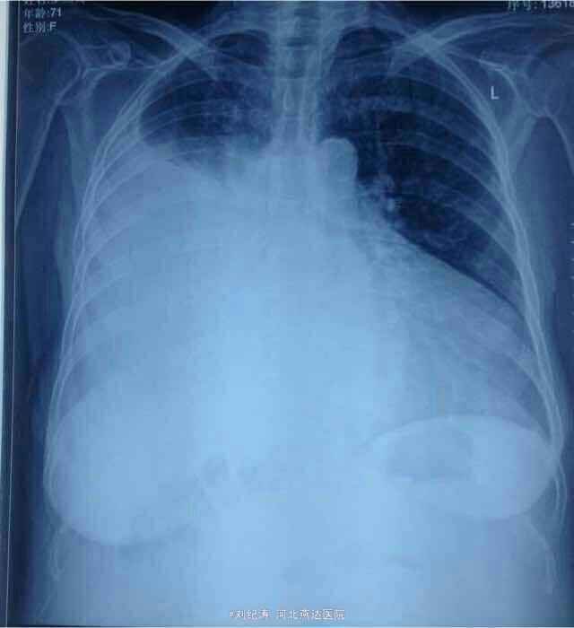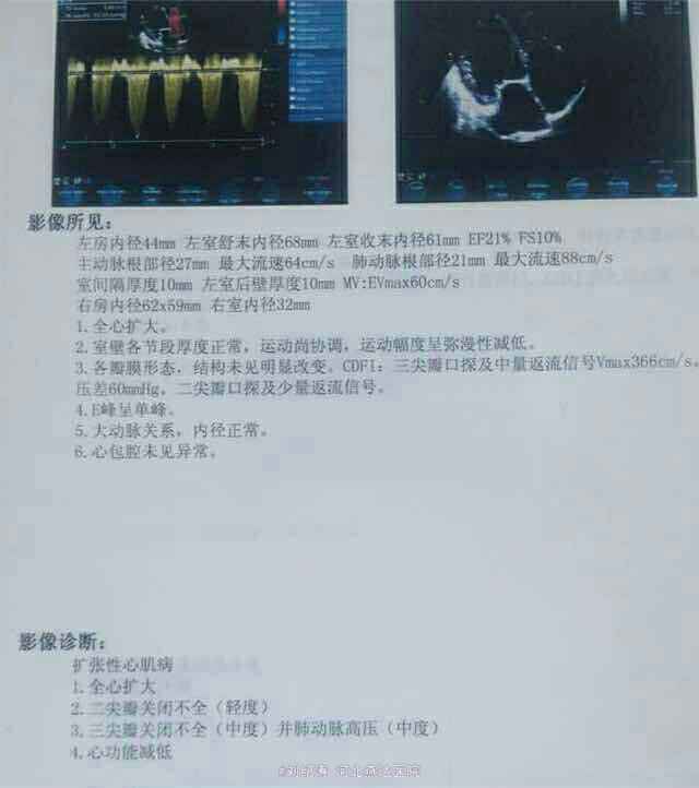 拟诊:1、扩张性心肌病 二、三尖瓣关闭不全 慢性心功能衰竭 2、右侧胸腔积液 3、腹腔积液(肿瘤不除外) 治疗:入院后完善检查,考虑心源性所致,给予胸腹腔穿刺置管流胸腹水(交叉放水),强心利尿、抗炎、扩管、纠正心衰及对症治疗一周,腹水明显减少,胸水未见明显减少,此时肿瘤标志物回示:CA125、CA199升高,遂行妇科彩超排除妇科肿瘤,结果未见异常,欲行CT进一步检查,患者家属未接受;继续引流胸水及对症治疗3天,患者腹胀、气喘症状明显好转,胸腔积液较前减少,欲行胸部CT进一步检查,患者未接受,切见症状好转,要求出院,反复劝说无效后予以出院。出院继续口服强心利尿药物。