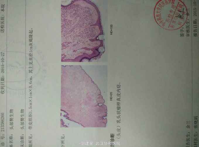 诊断:(头皮)乳头状瘤样真皮内痣 治疗:行激光切除病灶,切除物送病检