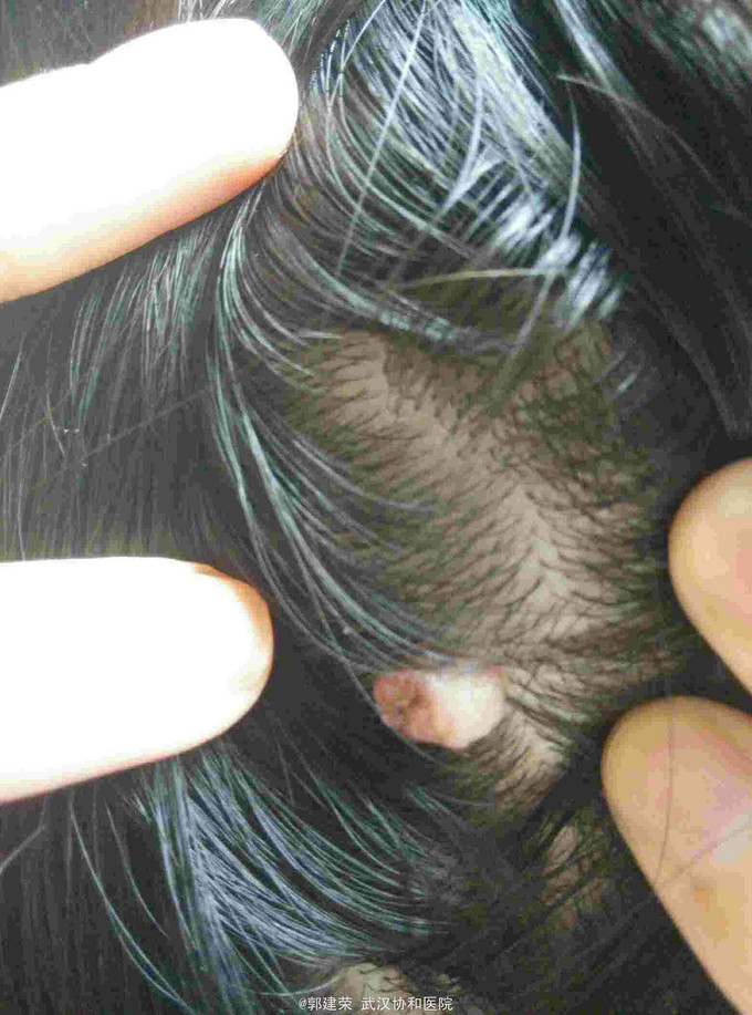 患者,女,25岁 主诉:发现头部肿物数年,产后增大两月余 病史:患者诉自幼发展右侧头皮后部可触及一肿物,直径约0.5cm,微突起于头皮,无其他伴随症状。患者于2015年6月产下一女,此后两个月该肿物迅速增大,现已突起于头皮约3cm,质稍软,无出血,破溃,疼痛等不适。今为进一步就诊收入我科。