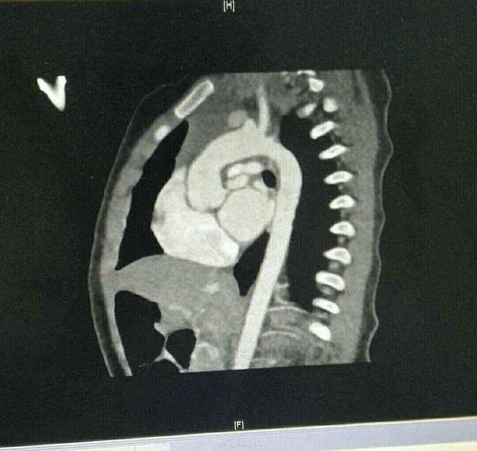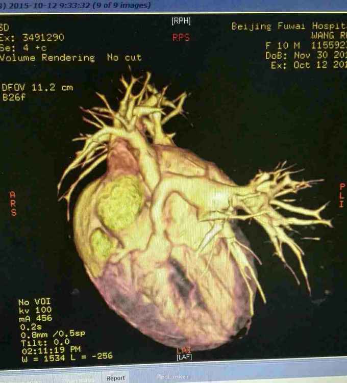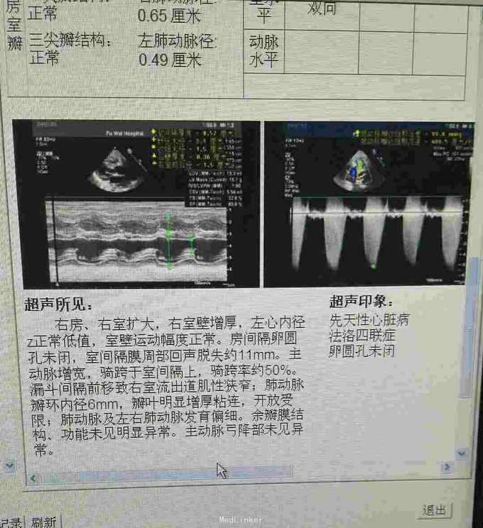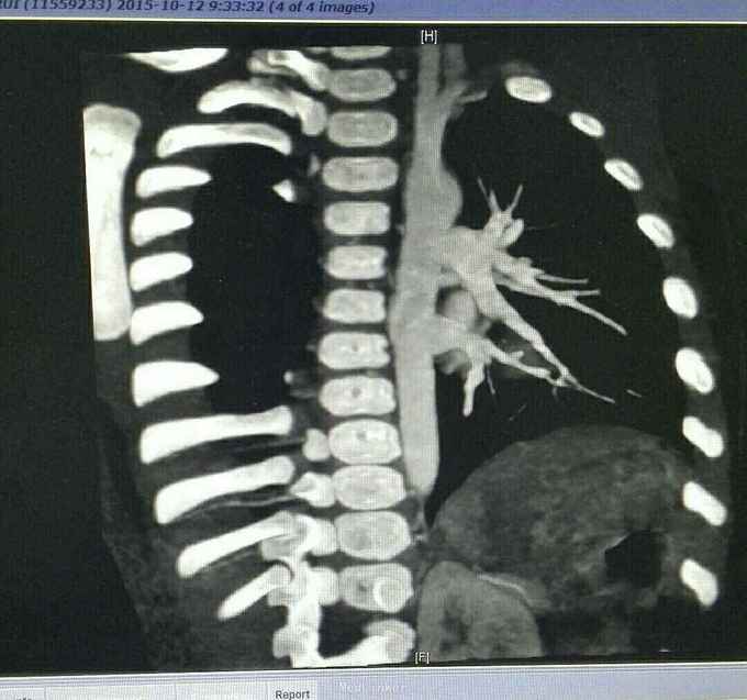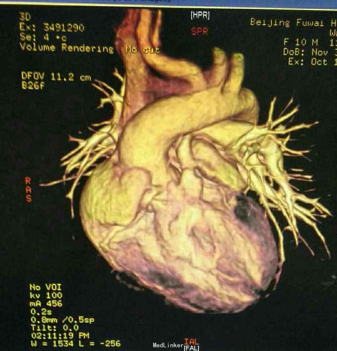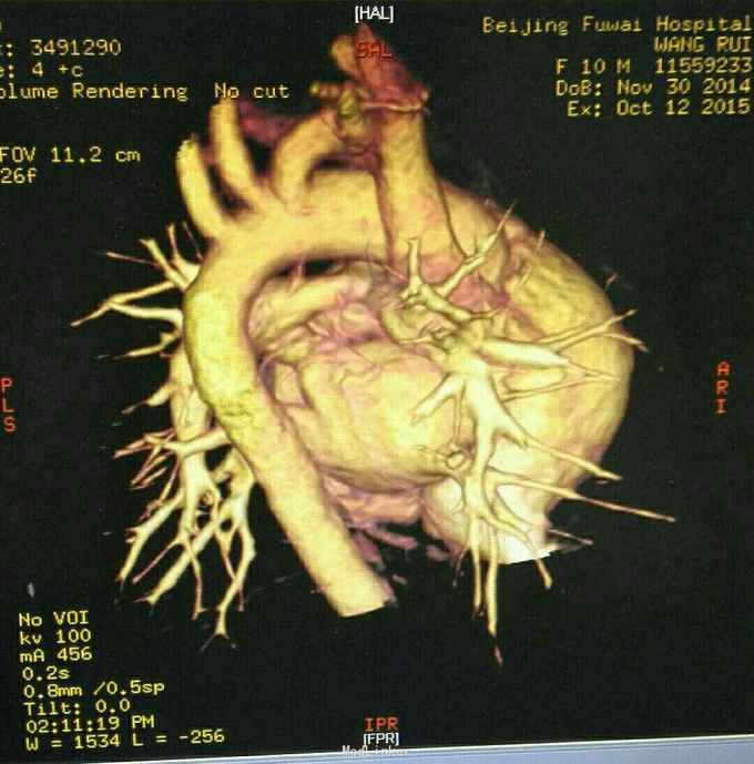查体 生命体征平稳,口唇发绀,双肺呼吸音清,未闻及干湿性罗音,心律规整,于胸骨左缘可闻及杂音,腹部平软无压痛反跳痛,双下肢无水肿。 辅助检查结果 心脏彩超示 先天性心脏病 法乐氏四联症 肺动脉发育不良 左肺动脉 0.65mm,右肺动脉 0.49mm。 心脏CT检查结果示 先天性心脏病 法乐氏四联症 肺动脉发育不良