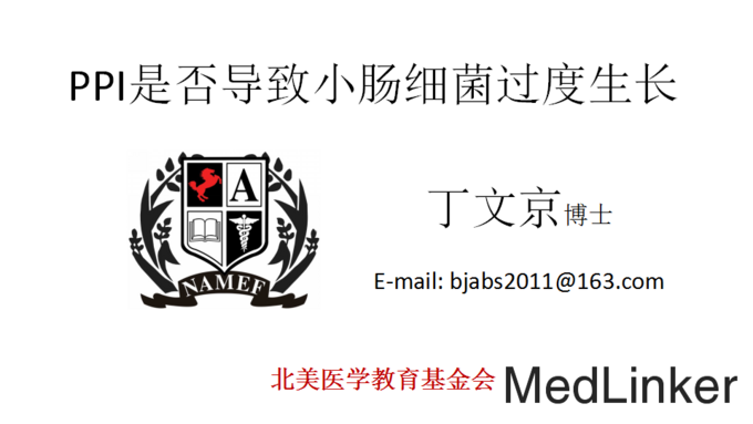 主讲内容:PPI是否导致小肠细菌过度生长 主讲人:北美医学教育基金会主席、波士顿大学医学博士 丁文京教授