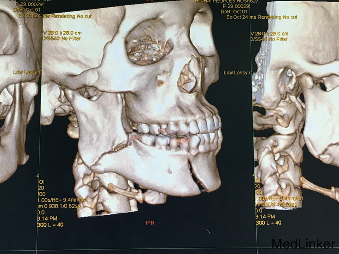随访:术中咬合恢复良好,被动张口度3.0cm,术后半年、1年、3年随访咬合良好,张口度正常水平。 讨论:下颌角部于外斜线处置接骨板,下缘无需再置接骨板。无需自口外颌下切口,避免损伤面神经下颌缘支。
