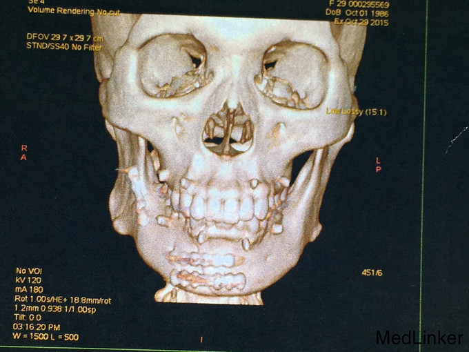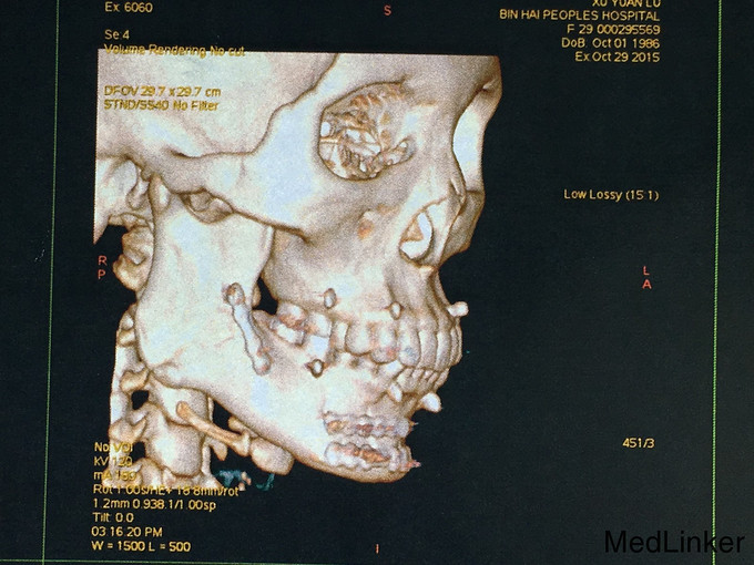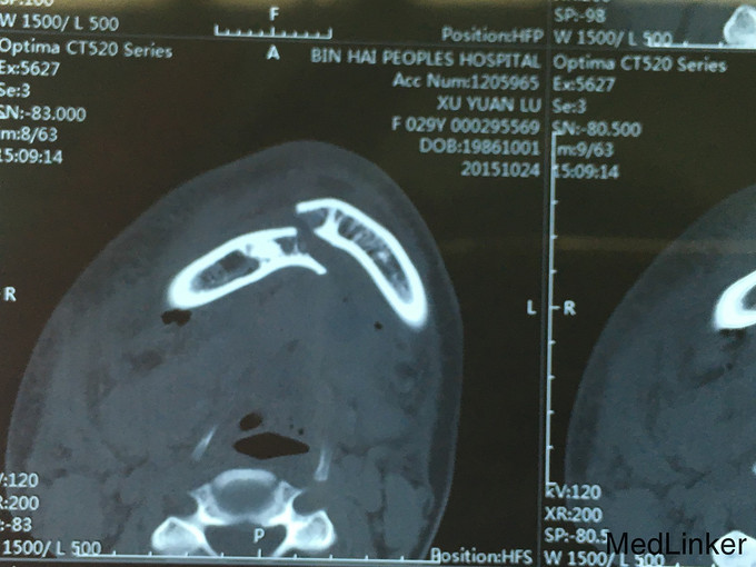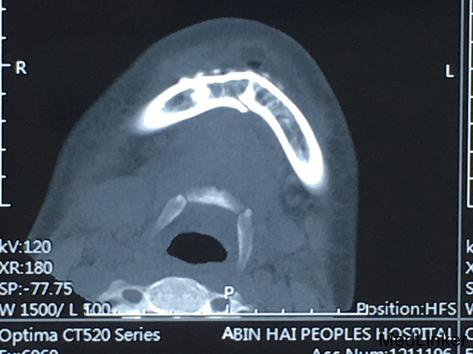 查体:神志清楚,右下颌体部见长约2.0cm开放创口,张口度1.5cm,咬合关系紊乱,右下唇麻木感,43,44间见明显骨折线,异常动度,48松动II,牙龈撕裂,右下颌肿胀,右侧髁状突冲击试验减弱,上颌骨无异常动度,于无异常。 辅查:CT,右下颌骨颏部及下颌角不骨折。