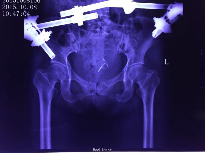 病情稳定后转入我康复医院,现骨盆外固定架已去除,感觉平面右侧自膝关节以下开始减弱,左侧自左踝处开始减弱,二便功能障碍,右下肢髋关节肌群肌力2级,股四头肌,胫前肌等肌力3级,左下肢诸肌群肌力3级。