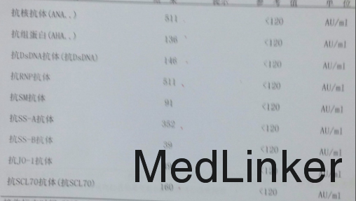 查体:T:37.0℃,P:80次/分,呼吸:20次/分,血压:109/73mmHg。意识清楚,对答切题,安静面容。全身浅表淋巴结未及。有双手、双足遇冷皮肤颜色发白、发紫。双侧瞳孔等大等圆,直径3mm,直接和间接对光反射存在。结膜无苍白,无充血、水肿。心率80次/分,心律齐,各瓣膜区未闻及病理性杂音。双肺呼吸运动对称,节律正常,触觉语颤正常,无胸膜摩擦感,双肺叩诊清音,双肺呼吸音清,未闻及干湿性啰音。右腕关节稍肿胀,有压痛,背伸受限。余四肢、关节未见明显异常。 4、辅助检查: 2015-07-24 外院血常规:血红蛋白101g/L。尿蛋白定性 20.0mg/dl,尿白细胞镜检14-18HPF,尿红细胞 0-3/HPF。C反应蛋白<0.319mg/dl 红细胞沉降率 9mm/h抗nRNP/Sm抗体阳性(+),抗SSA抗体阳性(+),抗核小体抗体阳性(+),其余抗Sm抗体、抗SSB抗体、抗Scl-70抗体、抗Jo-1抗体、抗着丝点抗体、抗双链DNA抗体、组蛋白抗体、抗核糖体P蛋白抗体均为阴性(-)。抗核抗体>1:1000阳性(颗粒均质),其余抗双链DNA抗体、抗ANCA、抗着丝点抗体、抗增殖细胞核抗原抗体均为阴性(-)。抗链球菌溶血素0测定<200U/mL;类风湿因子<9.75IU/mL。右腕关节超声:右侧腕关节少量积液,有轻度滑膜增生,右腕关节低回声区内见与骨面近平行登高-强回声线,距离骨面0.036cm。我院抗核抗体指标如图。