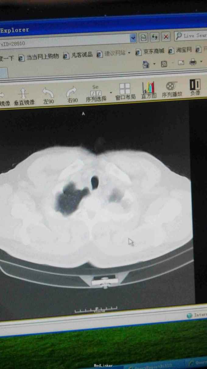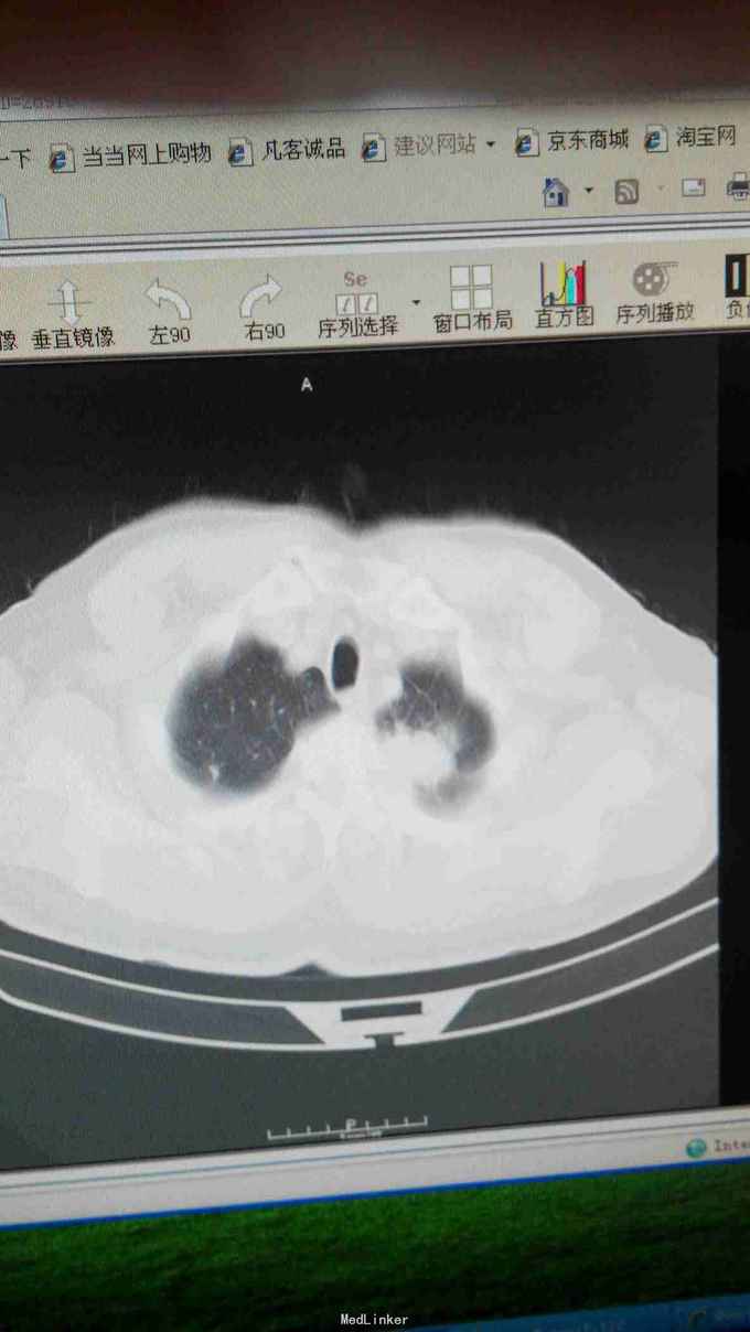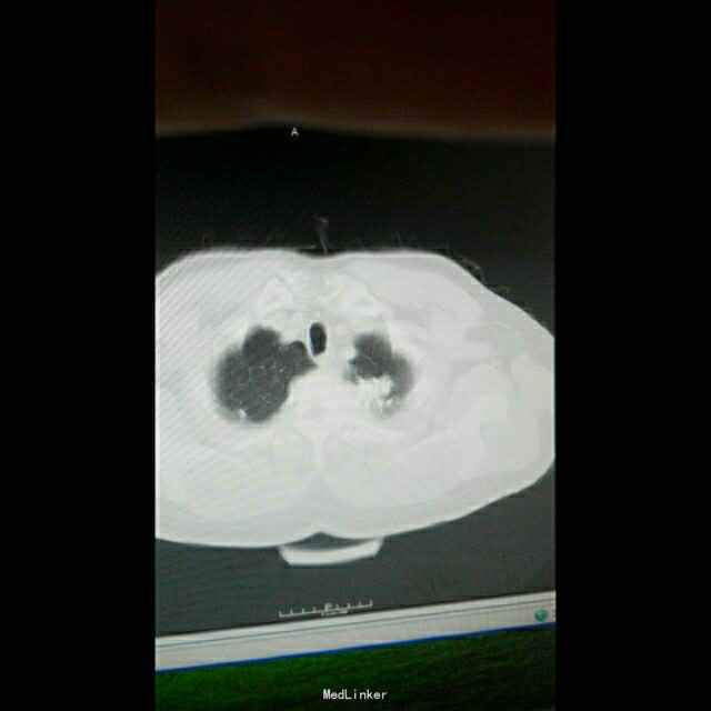 左肺癌化疗后,患者于2015年2月出现咳嗽咳痰,自行口服药物治疗,未见好转,于山西省肿瘤医院CT:左肺上叶肿物,考虑肺癌,周围型,病理示:左肺腺癌,给予(长春瑞滨40mgd1~2+顺铂30mgd1-4)化疗4周期,患者不愿再行静脉化疗,