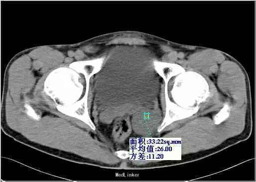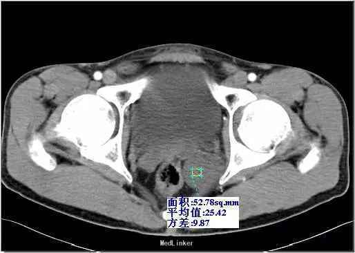 查体:左侧精囊区肿块,大小约3cm,质硬,活动度可,轻挤压痛,余体检无异常。实验室检查:血常规、生化、凝血、尿常规及肿瘤标记物化验未发现特殊异常。 影像检查:超声示盆腔内直肠中段左侧见一肿块图像,大小约4.4 cm×5.0 cm×3.2 cm,形状呈椭圆形,边界欠规整,内部为低回声,分布不均,后方回声无变化,彩色多普勒显示肿块内部可见少许点状血流信号。 CT示左侧精囊区见一肿块,大小约4.3 cm×3.6 cm;平扫呈稍低密度(相对邻近肌肉密度),密度不均,其内可见散在分布更低密度区,CT值约18-28HU,动脉期CT值20-28HU,静脉期CT值20-30HU,肿块边缘规整、边界清楚,与直肠膀胱分解清楚。