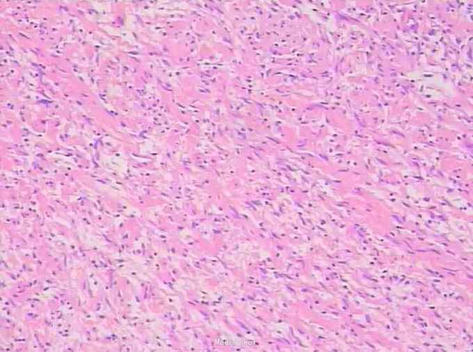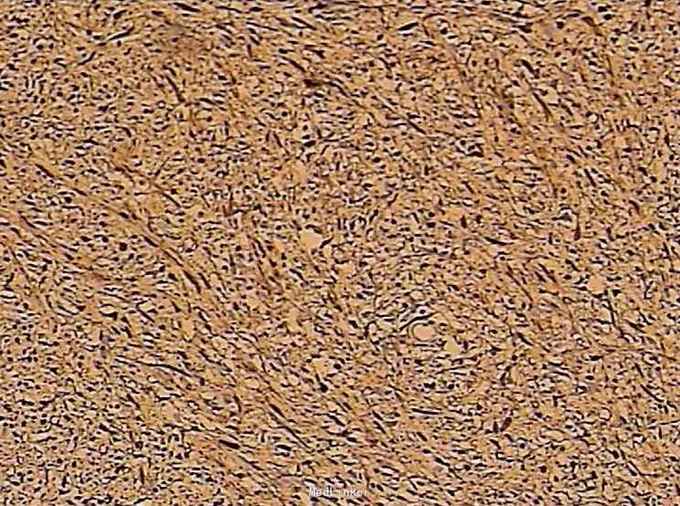 初步诊断:精囊肿瘤,性质不明。予手术切除治疗,术后病理:肉眼所见左侧精囊灰黄色包块,大小约4.5 cm×3.2 cm×2.6 cm,切面灰黄实性,质嫩。光镜下示瘤细胞核小,卵圆,无明显的细胞突起,为梭形细胞肿瘤;免疫组化:S-100(+),EMA(-),CK(-),VIM(+),CD34(部分+),CD117(-)。最后诊断:(原发性精囊)孤立性神经纤维瘤。