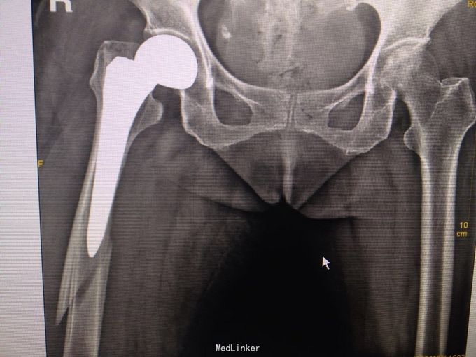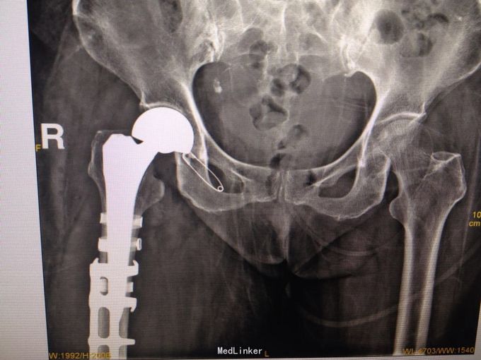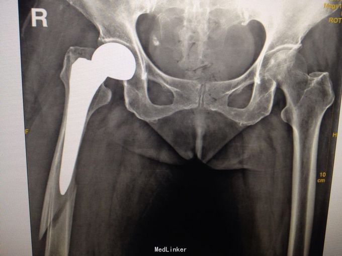 患者84岁女性,4周前因右股骨颈骨折行人工股骨头置换术,术顺,恢复佳,4天前摔倒,致右大腿肿痛,立行不能