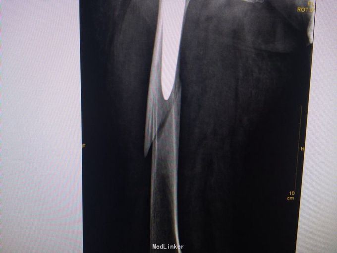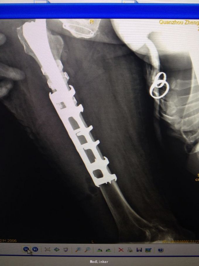 右髋部手术瘢痕,无破皮出血及骨质外露,右股骨中段压痛,右股骨纵向叩痛阳性,末端血运感觉好。 X线提示右股骨中段骨折,上段见人工股骨头置换术后,