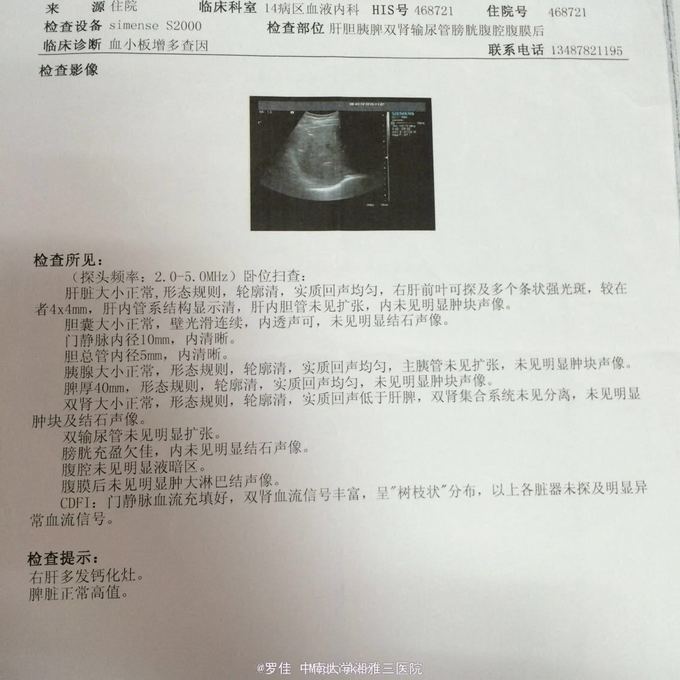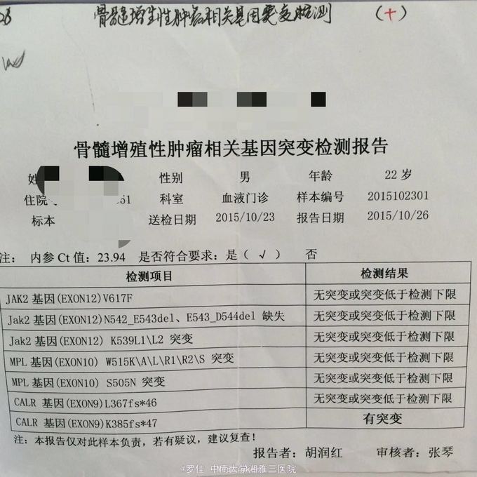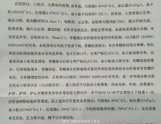 入院后完善相关检查(肝肾功能,心电图,胸片均无异常)其他检查见图片 予以羟基脲片降血小板,予以重组人干扰素抑制细胞异常增殖,同时护心,护胃,护肝等对症治疗。患者无发热,乏力等不适。