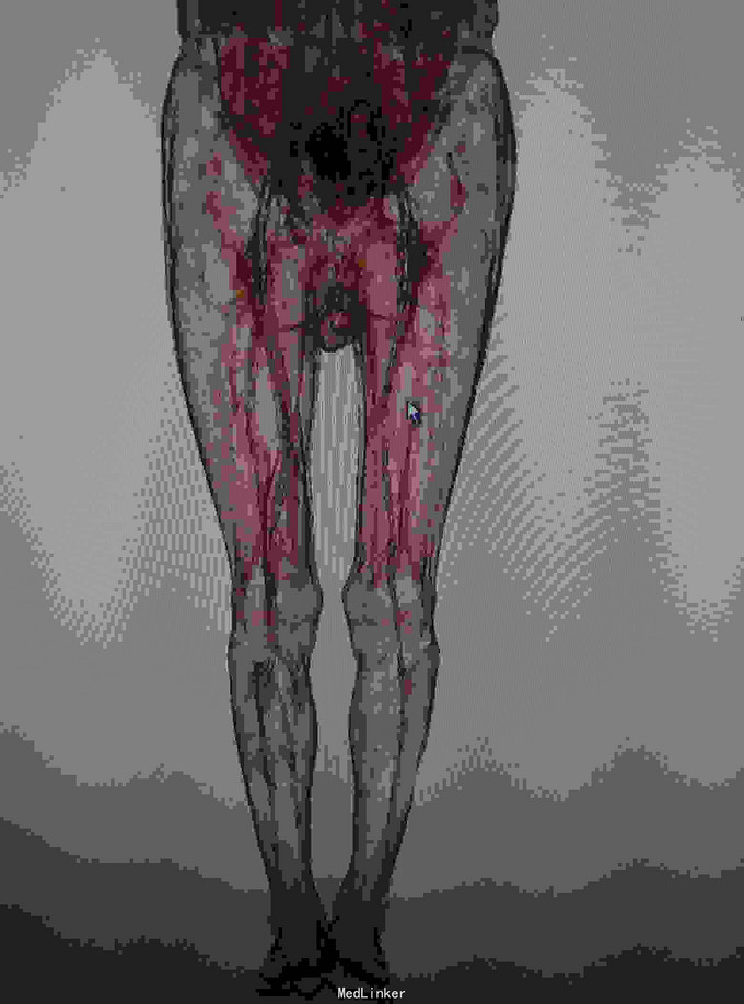 左下肢皮温降低,左足背可见紫红色淤斑,左股动脉扪及微弱波动。下肢血管成像提示:双下肢动脉节段性不同程度狭窄、闭塞。