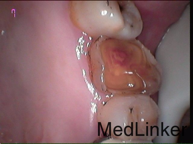 患者,右上后牙疼痛,冷热刺激痛,叩痛明显。右上56治疗后,烤瓷冠修复