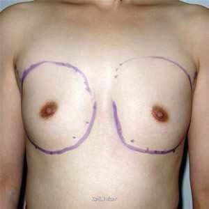 女,34岁。因青春期后双侧乳腺发育不良,双乳扁平,自认为缺少女性魅力,为改善胸部外观来院就诊,要求行假体隆胸术。考虑患者年龄较轻,双乳发育不佳,无明显皮肤松垂。