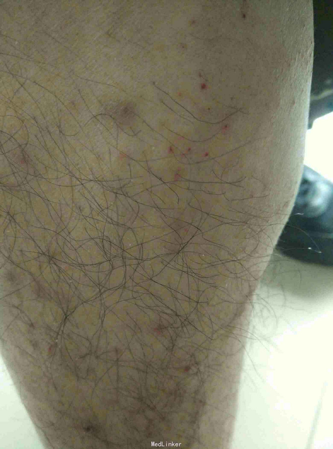主诉:双下肢散发褐色丘疹2日 病史:患者自诉2日前双下肢出现散发褐色丘疹,压之不褪色,触之无痒感,自觉偶有剧烈痒感。自诉两日前在草丛中劳动,近两日未洗澡、更换衣物。