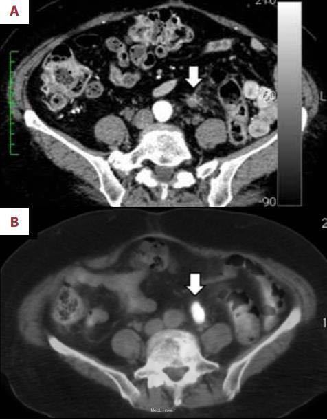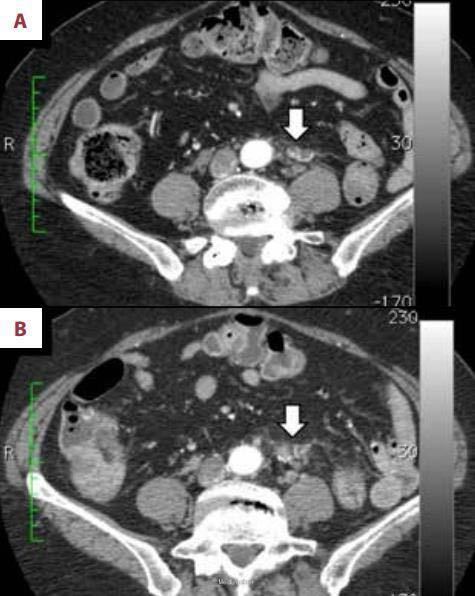 患者男性,69岁,5年前因大便带血于我院就诊,无其它不适主诉,结肠镜检查发现结肠肿瘤并肠腔狭窄,结肠镜无法通过。活检病理为高分化腺癌。CT检查示无浆膜侵袭和远处转移,临床分期为II期。行结肠癌根治术,周围淋巴结清扫。术后病理:癌灶已经侵蚀浆膜层,周围淋巴结未见转移征象,切缘阴性。术后患者每3个月来医院进行血生化复查,每6个月行腹部CT检查。 术后一年半后CT检查结果显示腹主动脉分叉处左侧见一边界模糊,非肿瘤性病灶,血供丰富(见下图1A)。考虑为术后结缔组织的炎症反应。随后几次复查发现该病灶的形态逐渐改变。术后三年CT检查结果显示病灶体积增大,但放射科医生依旧认为是良性病变(见下图1B)。最近来复查,上述病灶在CT上呈实性肿瘤样改变(见下图2A),怀疑为结肠癌术后局限性复发。但癌胚抗原和CA199都在正常范围内。为了明确诊断,患者去外院行FDG-PET/CT检查。检查结果如下图(2B),上述病灶呈明显高FDG摄取,除上述病灶外未发现其他存在病灶。