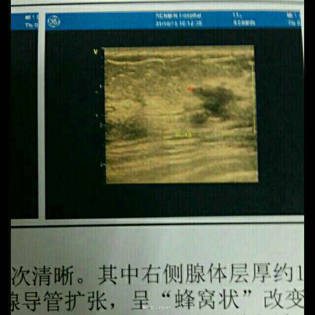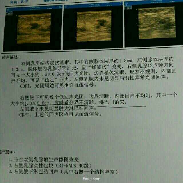 患者女26岁,未婚,发现右乳肿块2月,大小无明显变化,无红肿热痛。