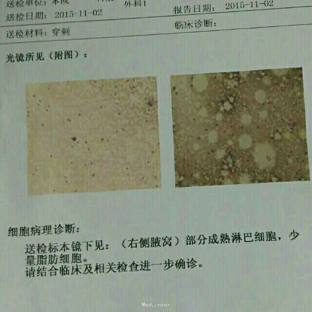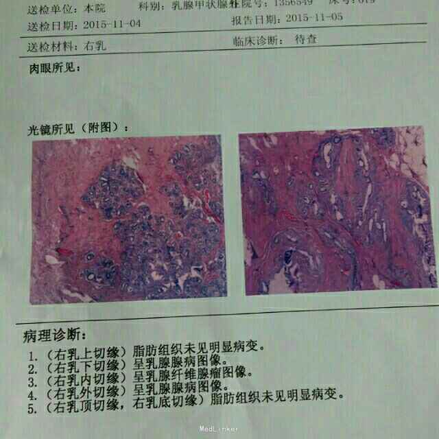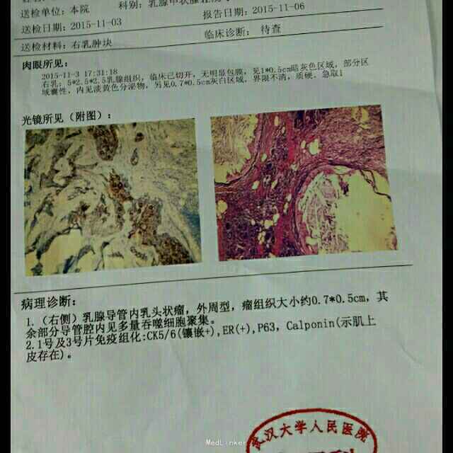 临床诊断右乳肿块,癌不能排除。 患者选择前哨+保乳手术。 术前右腋窝淋巴结穿刺阴性,术中大体标本见右乳1.8cm左右肿块,局部组织皱缩呈放射状,病灶弥散,局部囊性,有黄色乳酪样物质填充。 冰切提示外周型乳头状瘤,具体待常规,行局部扩大切除。 术后常规病检与术中一致,切缘良性,密切随访。