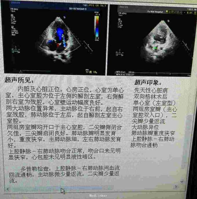 查体 生命体征平稳,口唇发绀,双肺呼吸音清,未闻及干湿性罗音,心律规整,于胸骨左缘可闻及杂音,腹部平软无压痛反跳痛,双下肢无水肿。 辅助检查 心脏彩超示 先天性心脏病 双向Glenn术后 单心室 大动脉转位 肺动脉瓣重度狭窄 上腔静脉-右肺动脉吻合口通畅。 心脏CT 先天性心脏病 双向Glenn术后 单心室 大动脉转位 肺动脉瓣重度狭窄 上腔静脉与右肺动脉连接。