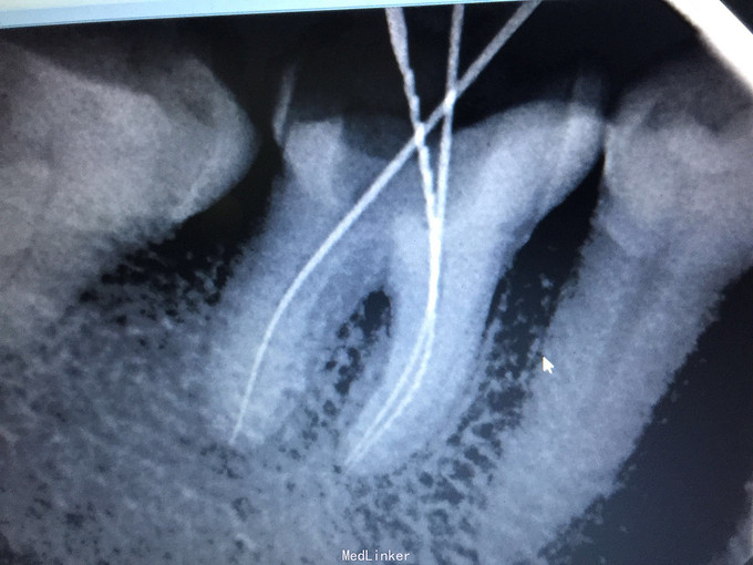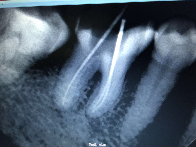 诊断:46急性牙髓炎 治疗:46局麻下开髓揭顶全,慢失活,暂封,肿痛随诊。 二诊:46去暂封及失活剂,根管长度测量,根管预备,冲洗,干燥,根管消毒,根充,适充,锌基,树脂充填,调合,抛光,告医嘱。 建议46冠修复。