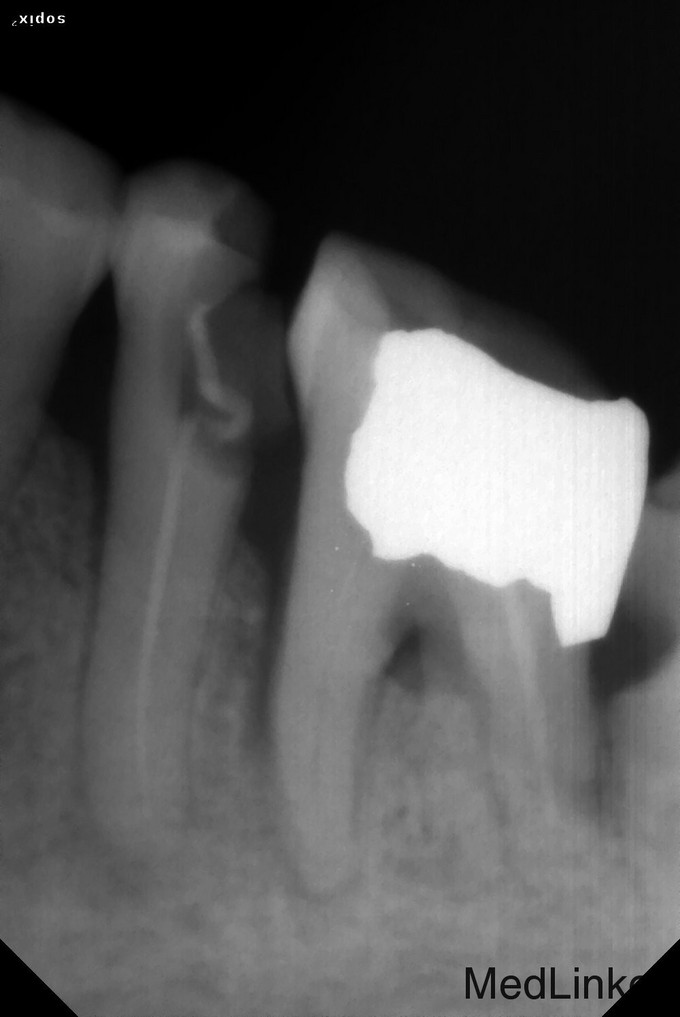 主诉:左下后牙约诊间疼痛,转诊。 现病史:患者68岁,男性,高血压治疗,无不良嗜好。 患牙曾于外地“治疗牙神经”,后偶有疼痛,9日前因急性根尖周炎来我科第一次就诊:35#去除不良充填体及根管内旧充填物,根管内溢脓,0.7%次氯酸钠冲洗,CP棉球,ZOE暂封一周。 2日前复诊:患牙疼痛减轻,检查见35#暂封完好,叩诊叩痛(-),探诊探痛(-),处置:35#根管预备至40#,20mm,冠方参照点为近颊洞缘,氢氧化钙根管消毒,CP棉球,ZOE暂封。现疼痛1日,无法耐受,复诊并转诊。(注36#另有治疗方案,不影响35#治疗,不赘述)