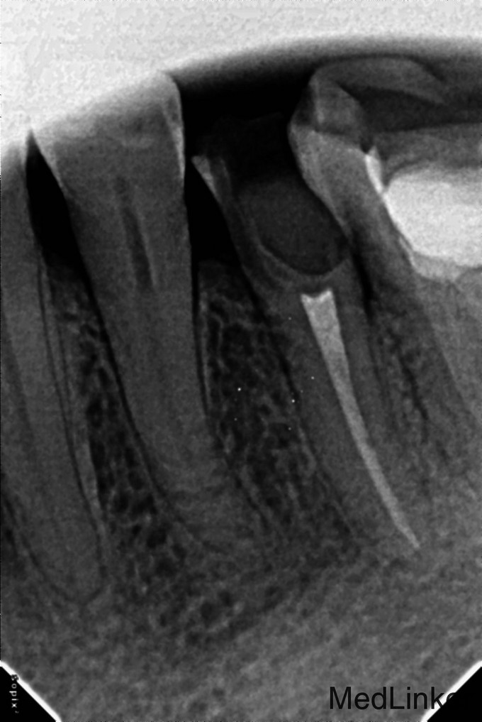 一年后复查:患牙正常使用,无明显异常。检查:充填物在,叩诊叩痛(-),X线片示:根尖周骨小梁致密。 讨论: 1、现代根管治疗学认为根管开放引流是根管治疗后疾病的一大病因,我个人也主张:不做没必要的开放。但是,不等于严禁根管开放。 2、本世纪初以前有学者认为,开放减轻了疼痛是因为通过氧气消灭根管内的“厌氧菌”,我个人认为:开放是为了脓腔引流。 3、开放的一个不可忽视的问题是,口腔内细菌的逆向根管内定植,同时根尖孔(相对于引流通路)过于狭小经常被脓栓阻塞,以及下牙没有重力引流的可能。口腔含漱液的使用可以暂时减少口腔内的细菌,以及局部吮吸,可以有效减小开放的副作用——局部吮吸,灵感来自于“负压引流”。 4、开放引流的时间根据病人以及患牙的具体情况而定,经验(血淋淋的教训)是随年龄增大而增多,最多多少天?还是应该以患者、患牙的状态为主要标准点,毕竟,开放是为了引流。我目前通常参考的时间控制是:年轻人1天,老人2天,此病例3天又是因为屈从于患者的就诊时间。故此复诊时加大了冲洗的程度。 5、此病例约诊间疼痛的病因首先考虑氢氧化钙的封药时机。氢氧化钙毕竟也有刺激性,激惹了根尖周组织。 6、氢氧化钙在根尖周炎中的作用有抗菌和诱导活化成骨细胞,而纳米羟基磷灰石可以直接提供成骨原料,碘仿及甲硝唑可以抗菌。 7、将塑化当作根管糊剂使用,并冷测压,目前一年后复查的病例较少,样本小,有待于进一步研究。