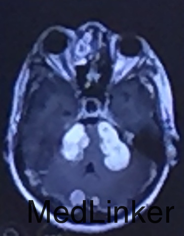 查体:双侧听力减退,四肢肌力、肌张力正常,病理征(-)。 辅助检查:神经系统MRI如下图所示:符合神经纤维瘤病NF2型。