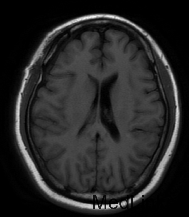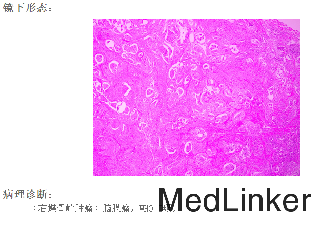 查体:双侧瞳孔等大等圆,直径约3mm,左侧对光反射灵敏,右侧对光反射迟钝,动眼自主,额纹对称,嘴角伸舌无歪斜。 2015-08-22当地医院查头颅MRI示:“右蝶骨嵴脑膜瘤”。