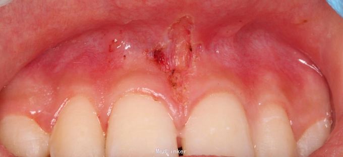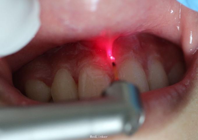 诊断:唇系带过短 处置:局部涂抹表麻膏,激光手术 建议:正畸治疗,关闭间隙,纠正咬合