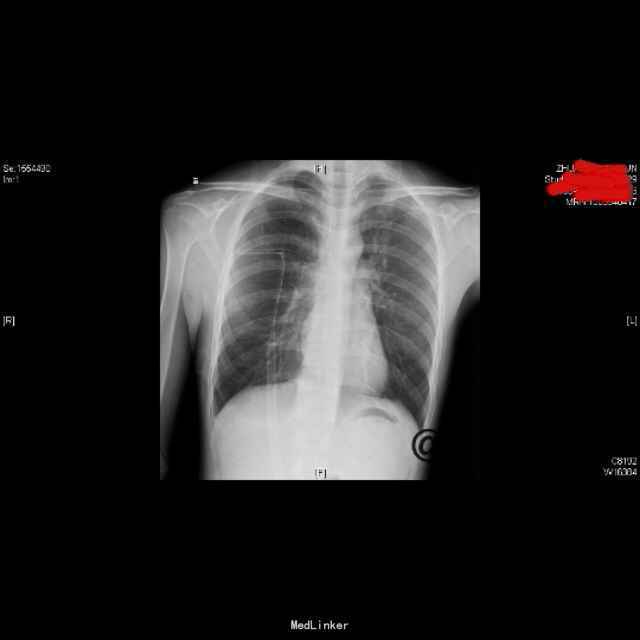 患者青年男性,27岁,瘦高体型,因“突发胸痛9小时,伴胸闷气促3小时”入院。 患者于2015-10-26上午约7时于步行中突感右胸痛,无心前区疼痛,无胸闷不适,无畏寒发热,无咳嗽咳痰,无恶心呕吐,无腹痛腹泻等,当时未予重视;中午12时参加体检,查胸片示:右侧气胸,右肺不张,压缩量约70%,建议及时就诊;下午2时左右患者仍感胸痛,出现活动后气促,伴胸闷不适,偶有咳嗽,遂来我院急诊,考虑右侧气胸,予头孢西丁抗感染,氨溴索止咳化痰,地佐辛静脉泵止痛,建议收入我科。遂以“右侧气胸”收入我科。