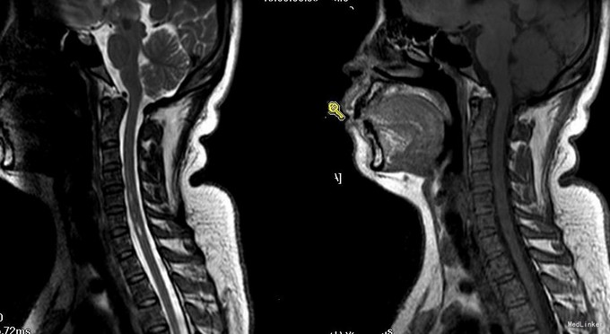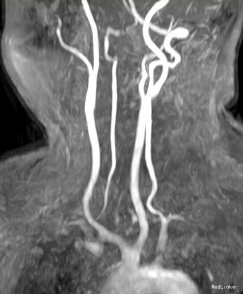 神经科查体:神清语明,步态平稳,查体合作,双瞳孔等大正圆,D=3.0mm,对光反射灵敏,双眼球各向运动充分,无眼震,无复视,额纹对称,双侧鼻唇沟对称,示齿口角不偏,伸舌居中,咽反射存在,转颈耸肩对称有力,四肢肌力Ⅴ级,肌张力正常,深感觉未见异常,右侧指鼻、轮替、跟膝胫试验略差,闭目难立征及走直线征阴性,BCR L++R++,PSR L++R++,Babinski征L-R-,颈软。余神经系统查体未见明显异常。 颅脑MRI检查,提示右侧小脑半球新发梗塞,颈椎MRI:颈3-4T2高信号。MRA提示双侧椎动脉狭窄