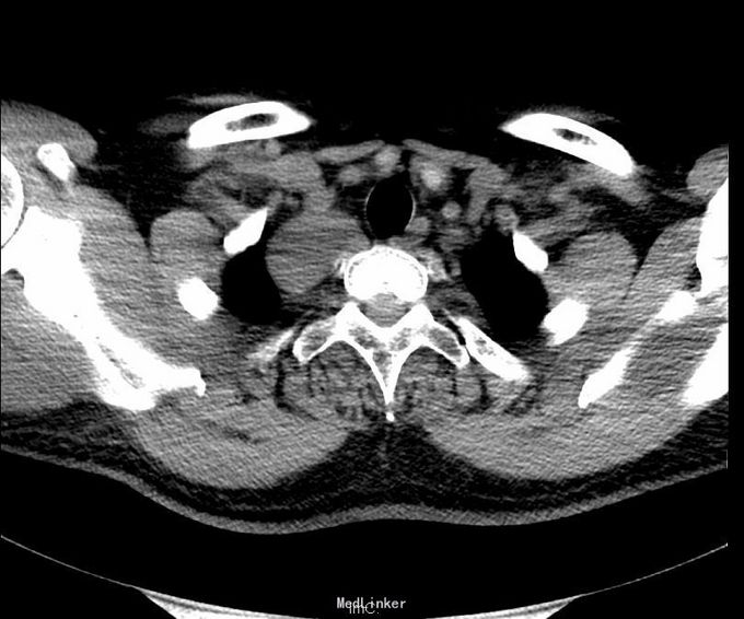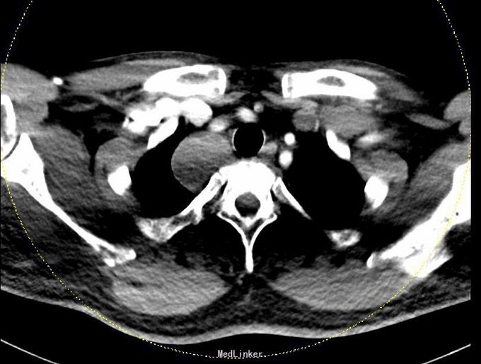患者,男,32岁3月,因“体检发现右侧胸腔肿块15+天”入院。患者15+天前体检发现右侧胸腔肿块,不伴发热,无咳嗽、咳痰,无四肢乏力,无上肢活动困难,无头晕、头痛,无胸背部疼痛,无下肢麻木、疼痛,无心前区压痛、牵涉与放射痛。为求进一步诊治来我院就诊,胸部CT扫描可见右后上纵隔肿瘤,门诊收入我科。患病以来精神食欲睡眠可,二便正常,体重无下降。