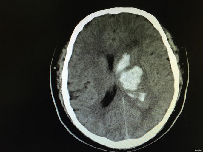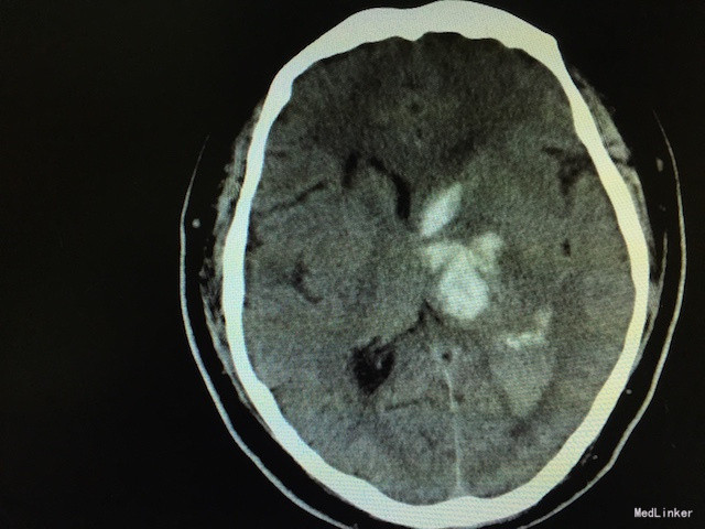 随访和讨论:一般脑出血的治疗原则为安静卧床、脱水降颅压、调整血压、防止继续出血、加强护理防治并发症。一般对于基底节区出血量中等量以上才考虑外科手术干预。尽早抢救病人,使病人病情尽快平稳后尽早行康复治疗可以提高患者出院后的生活质量。