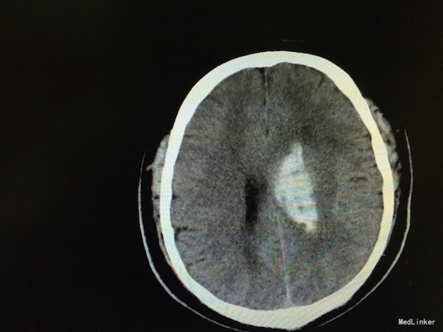 查体:右侧“三偏征”明显(偏瘫、偏身感觉障碍、偏盲),右病理征可疑阳性。 辅助检查:急诊行头颅CT,如下图,左侧基底节区出血。