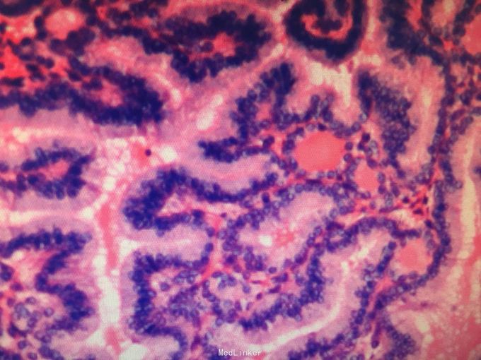 诊断 : 右附件区囊性肿物 治疗:全麻下行腹腔镜下右卵巢囊肿核除术,术中见,子宫常大,右侧附件根部扭转540度(1圈半),右附件表面无明显充血淤血及青紫,恢复其正常位置,见右侧卵巢囊肿约9*8cm,多房性,表面光滑,无明显坏死,左卵巢及双侧输卵管形态未见异常。完整核除右侧卵巢囊肿,术后石蜡病理回报:(右)卵巢甲状腺肿伴乳头状非典型增生,请注意复查。