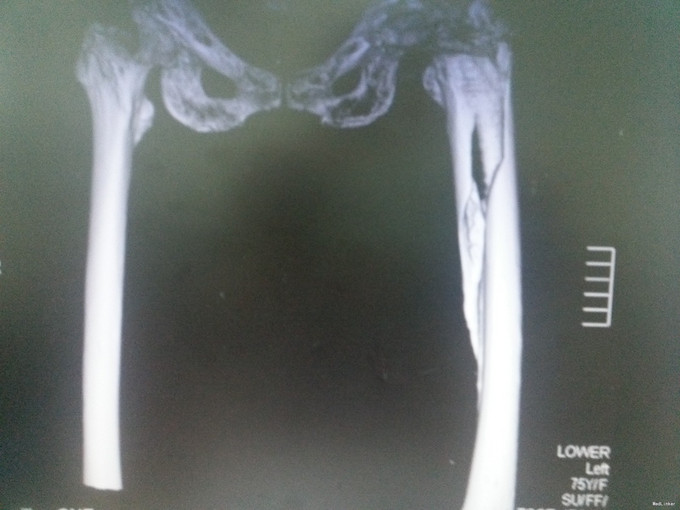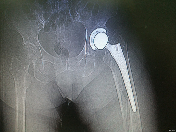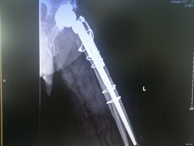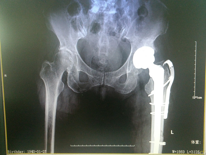 患者冯某,女,75岁 主诉:跌倒致左髋疼痛活动受限1日 现病史:患者2014年9月因先天性髋臼发育不良于我科住院,行左侧人工全髋关节置换术,昨日上厕所时不慎跌倒,即感左髋疼痛,活动受限,遂至当地医院就诊,查骨盆正位片提示:左侧股骨假体周围骨折,遂来我院就诊入院。 入院时:轮椅入院,一般情况良好。 既往史:既往高血压病史,平素规律服用厄贝沙坦0.15g po qd,尼莫地平30mg po bid,血压控制良好。既往中风病史,阿司匹林肠溶片100mg po qd。陈旧性肺结核病史。