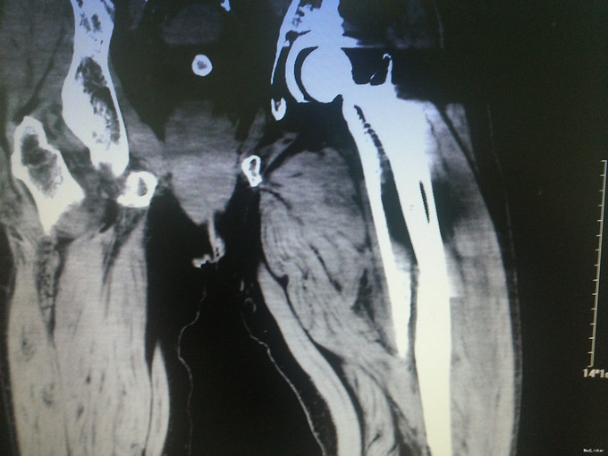查体:左髋可见一长约8cm的手术疤痕,局部无明显肿胀,左下肢杠力消失,纵向叩击痛(+),肢端血运、感觉及活动良好。 辅助检查:骨盆X片:左股骨假体周围骨折。