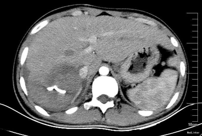 该患治疗过程不复杂。主要是疾病较少见。患者临床症状及检查首选诊断为肝脓肿。对于肝脓肿,可采用外科切除与介入抽吸治疗。外科手术损伤大,故介入治疗为首选。肝脓肿属于良性疾病,整体预后较好。该患者特殊在于:脓肿液化部分较少,病情实性部分一直没有继续液化。所以仍应考虑为占位病变,需行手术切除。切除病理证实结核。对于临床怀疑肝脓肿的患者需要多加思考,实性为主的占位穿刺取病理,如引流效果不佳需要外科手术干预。